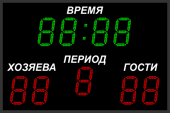 | Выводимая информация: | Счёт, игровое время, период, фолы, а также заранее запрограммированный текст |
