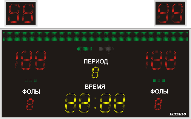 | Выводимая информация: | Счёт, игровое время, период, фолы, различный текст и т.д. |