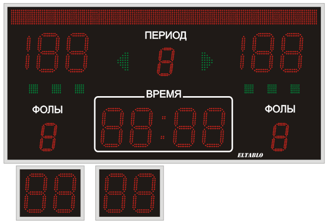 | Выводимая информация: | Счёт, игровое время, период, фолы, различный текст и т.д. |
