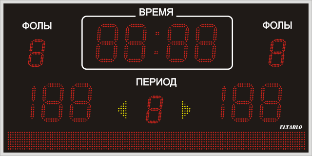 | Выводимая информация: | Счёт, игровое время, период, фолы, а также заранее запрограммированный текст |