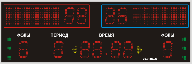 | Выводимая информация: | Счёт, игровое время, период, фолы, таймауты, указатели атаки, а также заранее запрограммированный текст |
