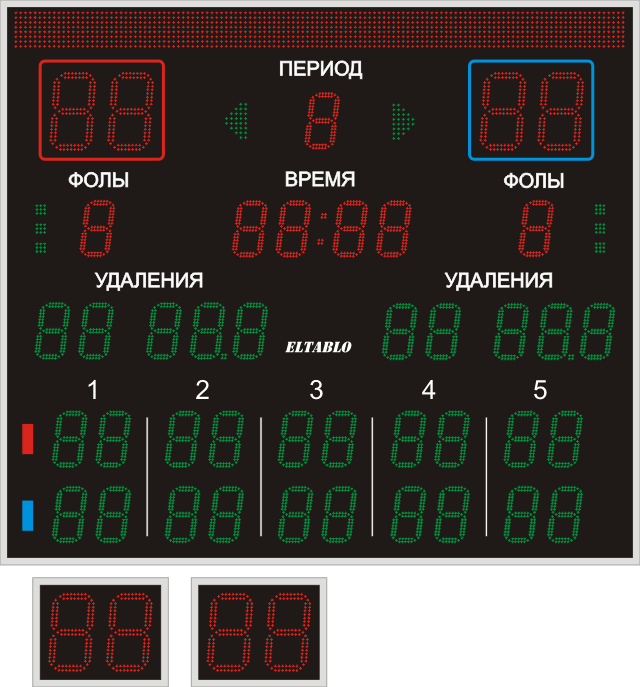 | Выводимая информация: | Счёт, игровое время, период, фолы, различный текст и т.д. |