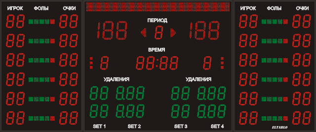 | Выводимая информация: | Счёт, игровое время, период, фолы, различный текст и т.д. |