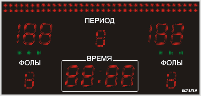 | Выводимая информация: | Счёт, игровое время, период, фолы, а также заранее запрограммированный текст |