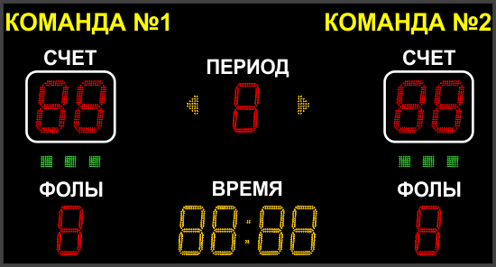 | Выводимая информация: | Счёт, игровое время, период, фолы, таймауты и указатели владения мячом |