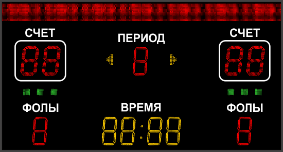 | Выводимая информация: | Счёт, игровое время, период и фолы, кол-во таймаутов, указатели, а также заранее запрограммированный текст |
