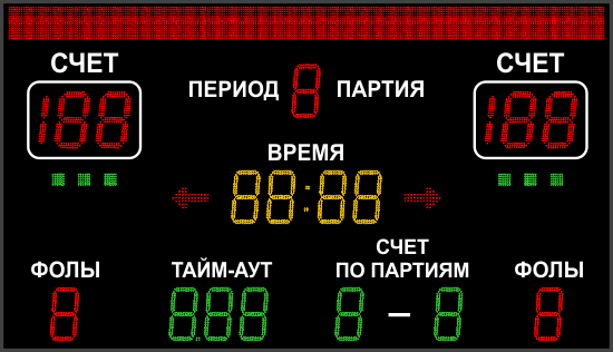 | Выводимая информация: | Счёт (текущий + по партиям), игровое время, период и фолы, кол-во и время таймаутов, указатели, а также заранее запрограммированный текст |