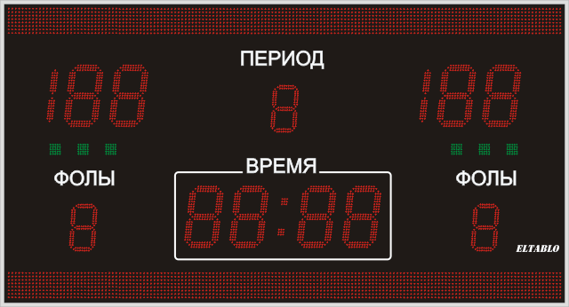 | Выводимая информация: | Счёт, игровое время, период, фолы, а также заранее запрограммированный текст |