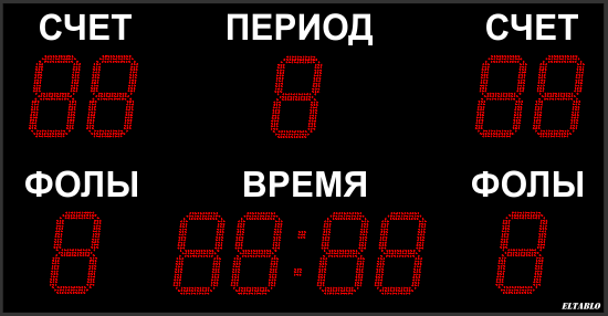 | Выводимая информация: | Счёт, игровое время, период и фолы |