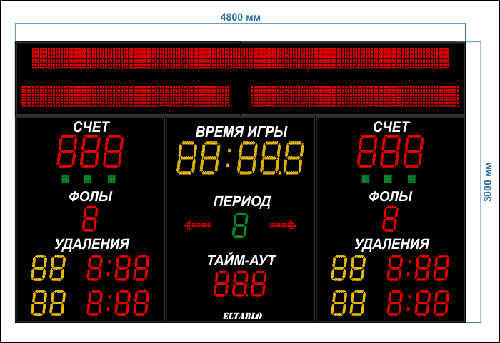 | Выводимая информация: | Счёт, игровое время, период, фолы, различный текст и т.д. |