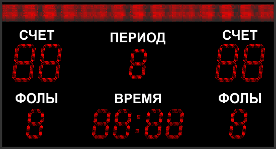 | Выводимая информация: | Счёт, игровое время, период и фолы, а также заранее запрограммированный текст |