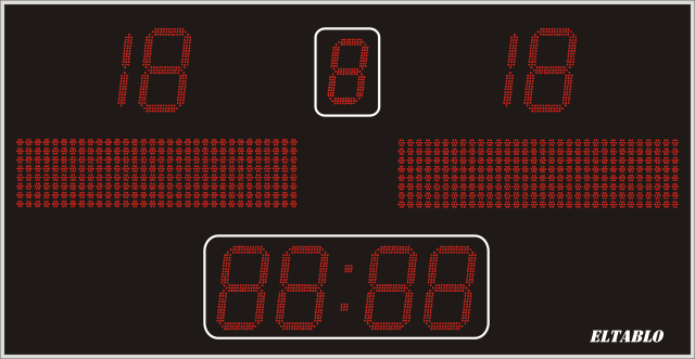 Табло выполнено из точечных светодиодов диаметром 5 мм. Образуют цифры разной высоты: 8 по 500 мм, 1 размером 270 мм. Предусмотрена плашка для выведения текста (названия команд, состав и т.п.). Максимальная дальность видимости составляет 80 метров. Управление прибором возможно двумя путями: беспроводным, за счёт радиопульта судьи (в комплекте) или проводным через подключение устройства к ПК. Длительность игры и текст настраиваются.