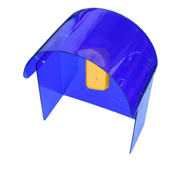 Уровень шумоподавления составляет -23 дБ. Полукабина изнутри обшита черным звукоизоляционным хлопком, материал изготовления армированный стеклопластик (фиберглас или GRP). Габаритные размеры 700х500х680 мм, вес 20 кг. Монтаж настенный. Цвет синий.
