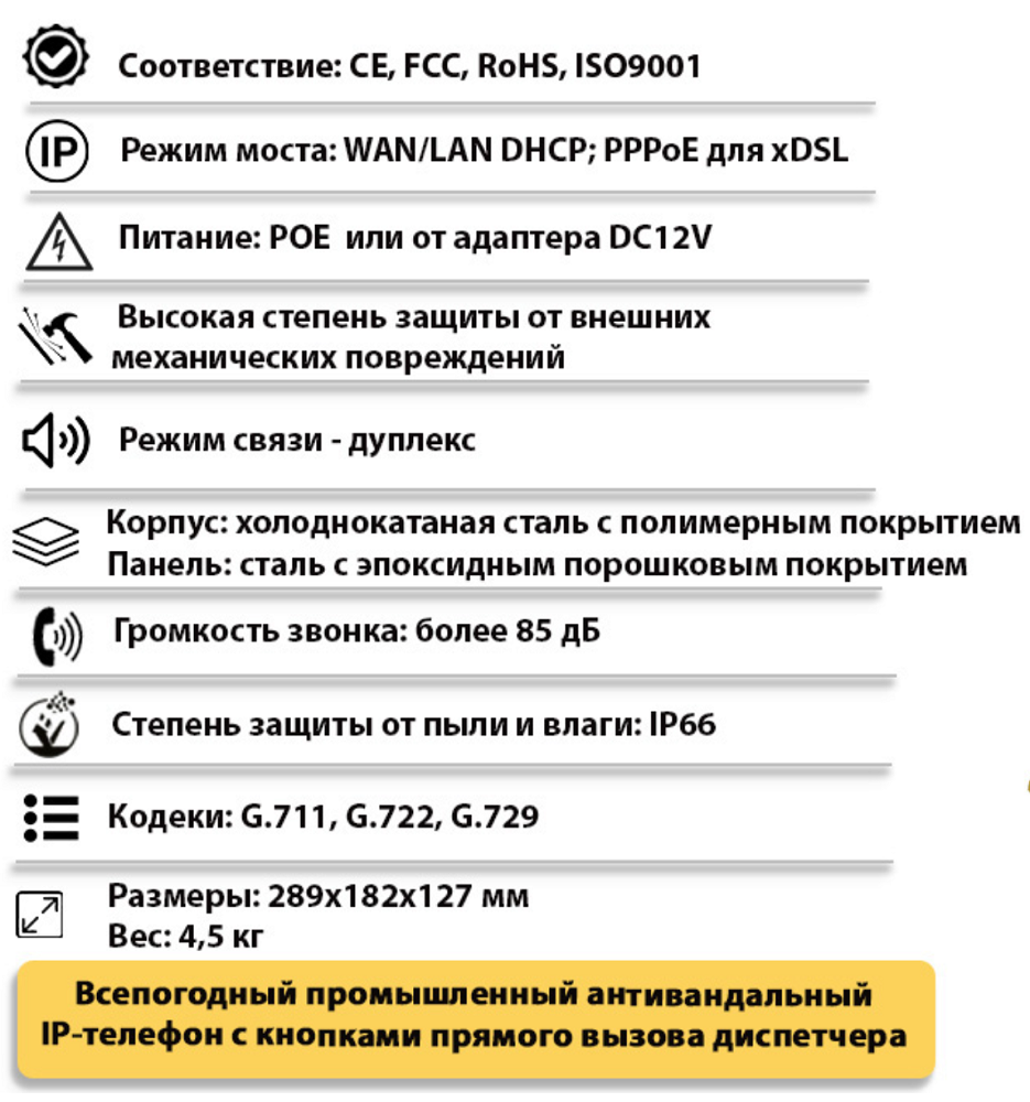 IP-интерком работает по протоколам связи VoIP SIP 2.0 с поддержкой IPv4, TCP, UDP, TFTP, RTP, RTCP, DHCP, SIP. Полный дуплекс, PPPoE для xDSL и режим моста WAN/LAN. Подключение к сети Ethernet производится через порт WAN 10/100Base-TX с Auto-MDIX, разъем RJ-45. Вместо номеронабирателя предусмотрены две кнопки: нажатие на одну приводит к вызову и установлению связи, а вторая используется для ответа на входящий звонок и сброса разговора. Один динамик, хорошая слышимость даже в условиях повышенных фоновых шумов, громкость звонка и разговора не менее 85 дБ. Используется эхоподавление и аудиокодеки G.711, G.722, G.729. Высокий уровень устойчивости к помехам.