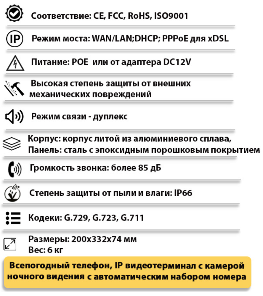IP-интерком работает по протоколам связи VoIP SIP 2.0. Полный дуплекс, поддерживается DHCP для получения IP-адреса на порту WAN, PPPoE для xDSL, режим моста WAN/LAN. Подключение к сети Ethernet производится через порт WAN 10/100Base-TX с Auto-MDIX, разъем RJ-45. Вместо номеронабирателя предусмотрена кнопка, нажатие на которую приводит к вызову и установлению связи. Один динамик, хорошая слышимость даже в условиях повышенных фоновых шумов, громкость звонка и разговора не менее 85 дБ. Используются аудиокодеки G.729, G.723, G.711. Высокий уровень устойчивости к помехам.