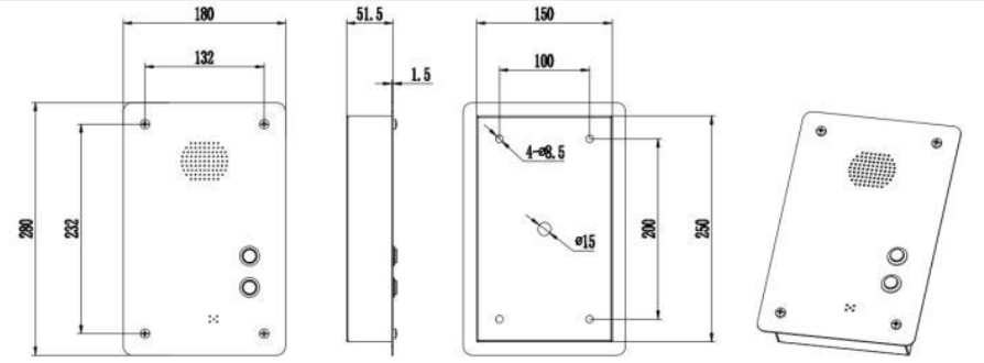 Габаритные размеры 280х180х51.5 мм, вес 3 кг. Монтаж врезной, посадочные размеры 250х150 мм. Цвет серебристый. Питание от телефонной линии. Соответствует стандартам CE, FCC, RoHS, ISO9001.