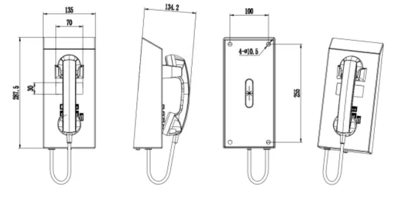 Габаритные размеры 287,5х135х134,2 мм, вес 3,5 кг, стальной цвет (другие цвета опциональны). Питание от телефонной линии, напряжение 20-75В DC. Монтаж на стену или иную вертикальную поверхность. Важно отметить, что в месте размещения ТА обязательно предусмотреть наличие свободного пространства, чтобы доступ к фронтальной и боковой частям ТА был беспрепятственным. Соответствует стандартам CE, FCC, RoHS, ISO9001.