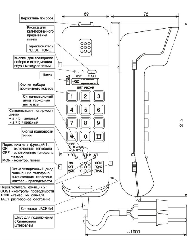 Телефон предназначен для тестирования телефонных линий в пределах питающего тока 15-70 мА. Три светодиода позволяют получить оптическую индикацию о ходе тестирования. Прибор позволяет осуществлять контроль проводимости линии, замыкания линии, передачу НЧ сигнала 900 Гц, определение полярности при помощи светодиодов, оптический и акустический контроль наличия тарификационных импульсов 16 кГц, контроля НЧ сигнала и мониторинг линии с большим входным сопротивление.