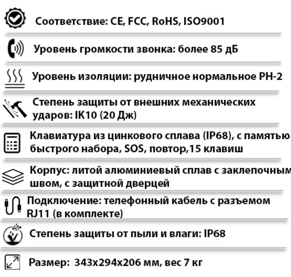 | Тип изделия | Промышленный всепогодный аналоговый телефонный аппарат с дверцей |