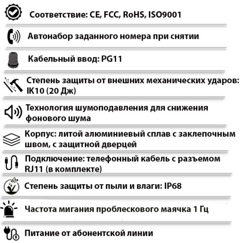 | Тип изделия | Промышленный всепогодный аналоговый телефонный аппарат с дверцей, проблесковым маячком и без клавиатуры |