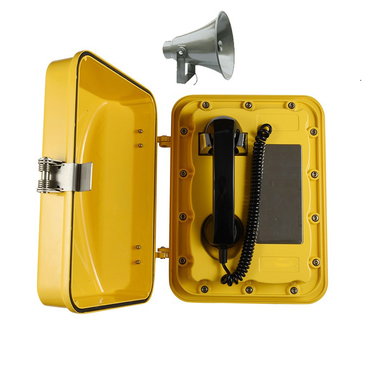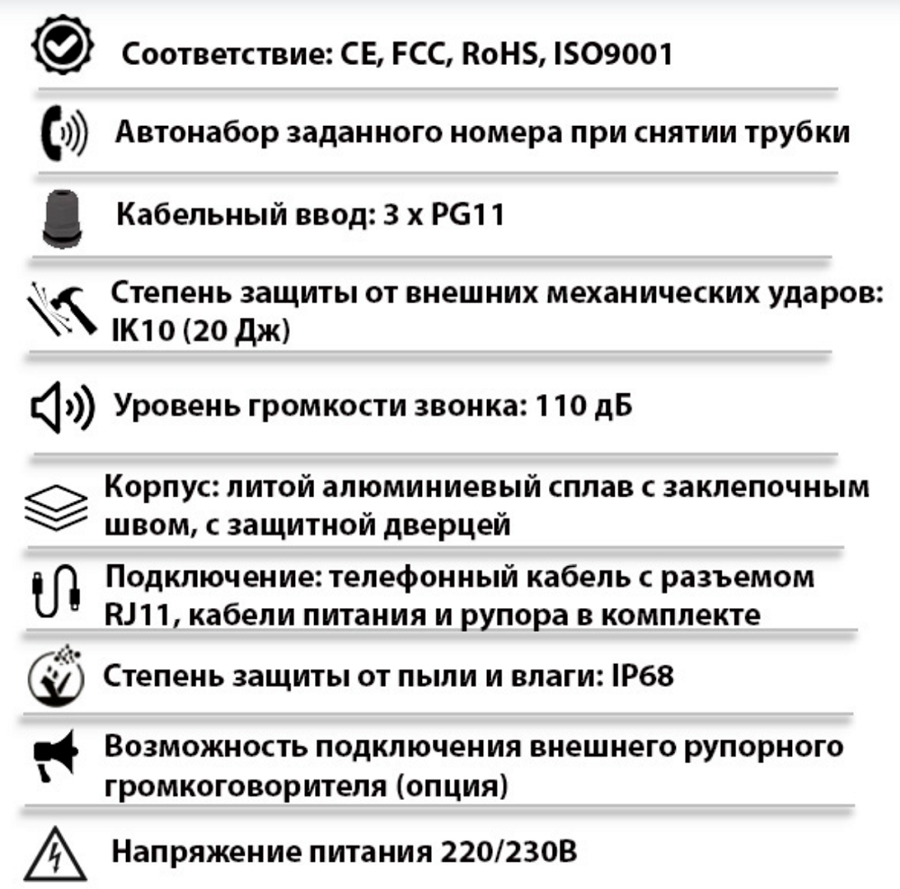 | Тип изделия | Промышленный всепогодный аналоговый телефонный аппарат с дверцей, рупорным громкоговорителем и без клавиатуры |