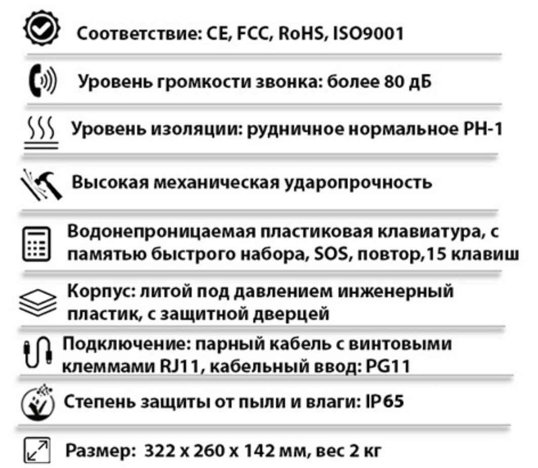 | Тип изделия | Промышленный всепогодный аналоговый телефонный аппарат с дверцей |