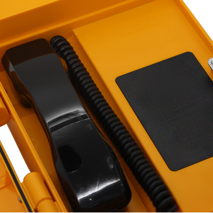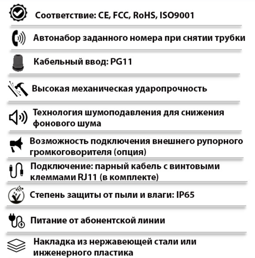 Аналоговый телефон применяется в стандартных телефонных сетях, подключение производится кабелем с разъемом RJ11 (поставляется в комплекте). Без номеронабирателя, при поднятии трубки происходит автоматический дозвон на записанный в память номер (например, диспетчерской). Громкость акустического сигнала (звонка) при вызове >95 дБ, частотный диапазон встроенного в трубку микрофона 250 – 3000 Гц, при разговоре используется технология активного шумоподавления.