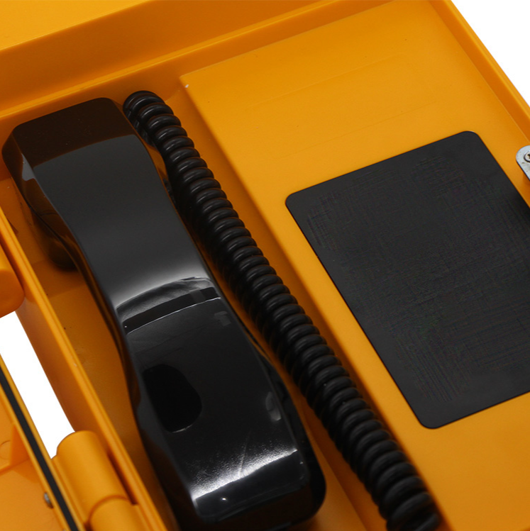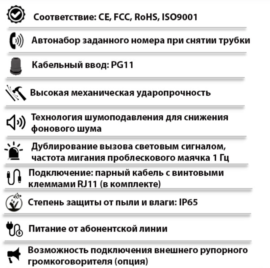 Аналоговый телефон применяется в стандартных телефонных сетях, подключение производится кабелем с разъемом RJ11 (поставляется в комплекте). Без номеронабирателя, при поднятии трубки происходит автоматический дозвон на записанный в память номер (например, диспетчерской). Громкость акустического сигнала (звонка) при вызове >95 дБ, частотный диапазон встроенного в трубку микрофона 250 – 3000 Гц, при разговоре используется технология активного шумоподавления. Для дублирования вызова светом предусмотрена лампа-вспышка, которая обеспечивает мигание с частотой 1 Гц.