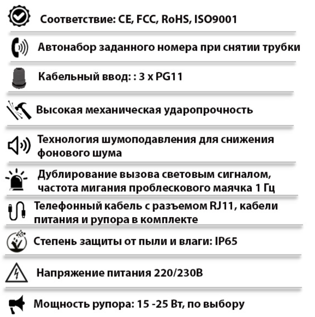 | Тип изделия | Промышленный всепогодный аналоговый телефонный аппарат прямого дозвона с дверцей, рупором и проблесковым маячком |