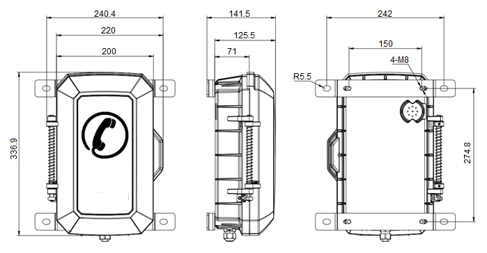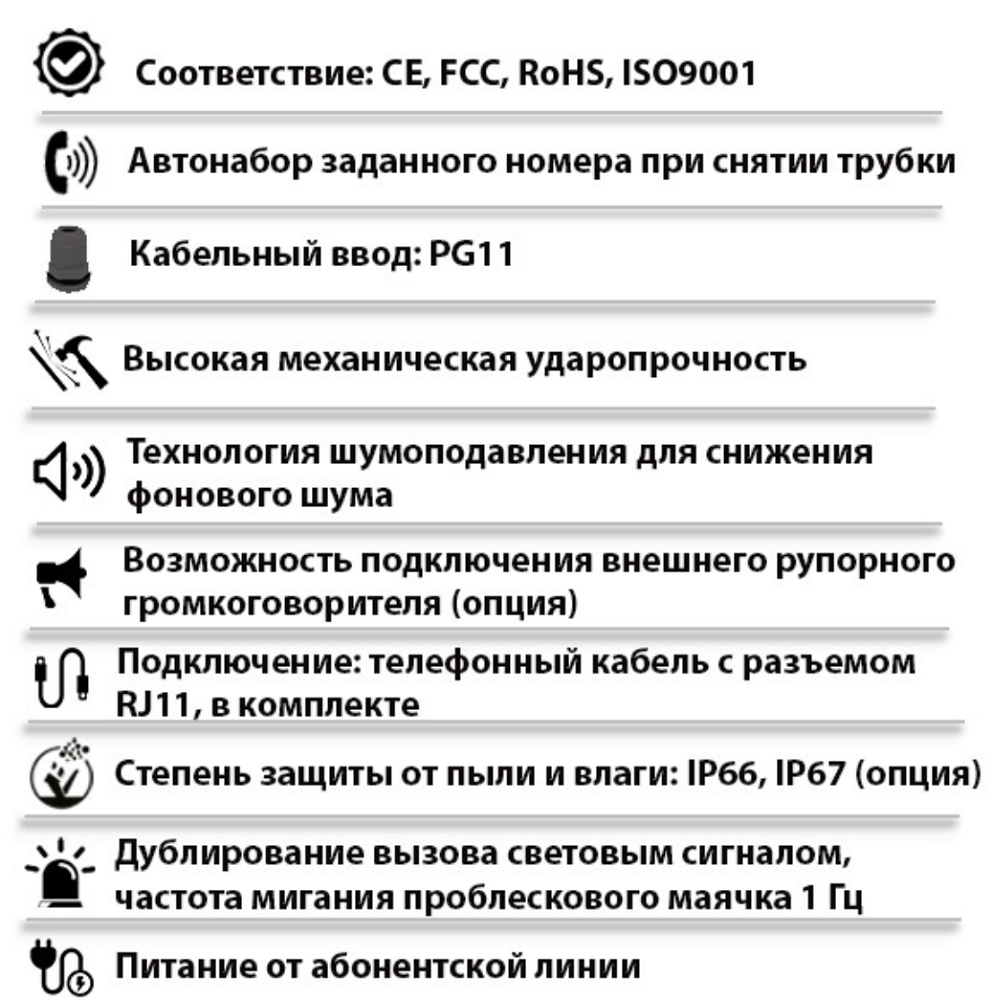 | Тип изделия | Промышленный всепогодный аналоговый телефонный аппарат с дверцей, проблесковым маячком и без клавиатуры |