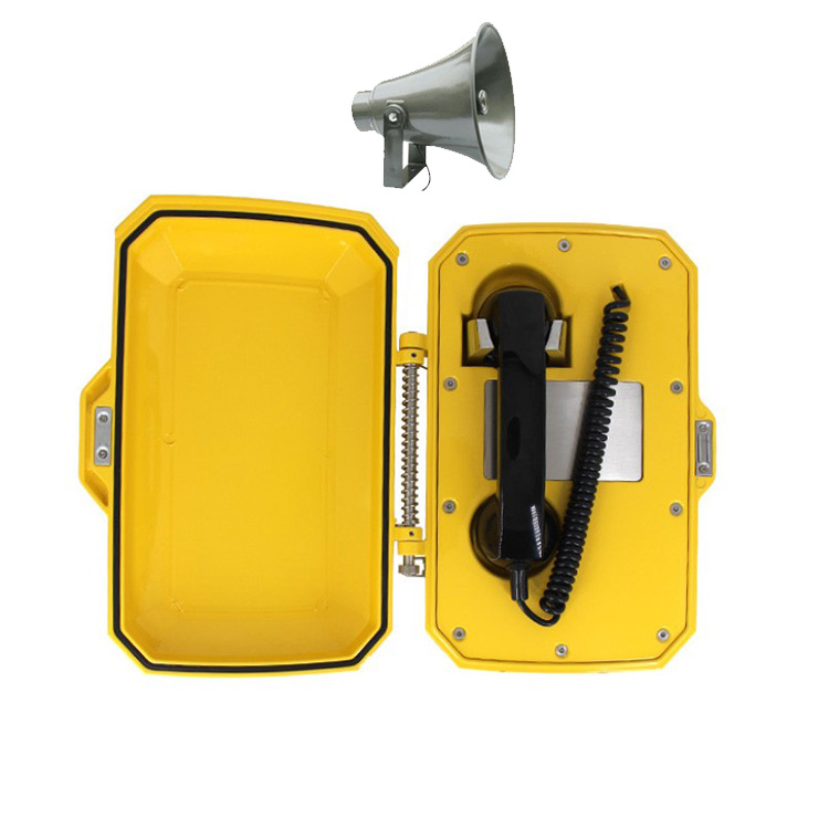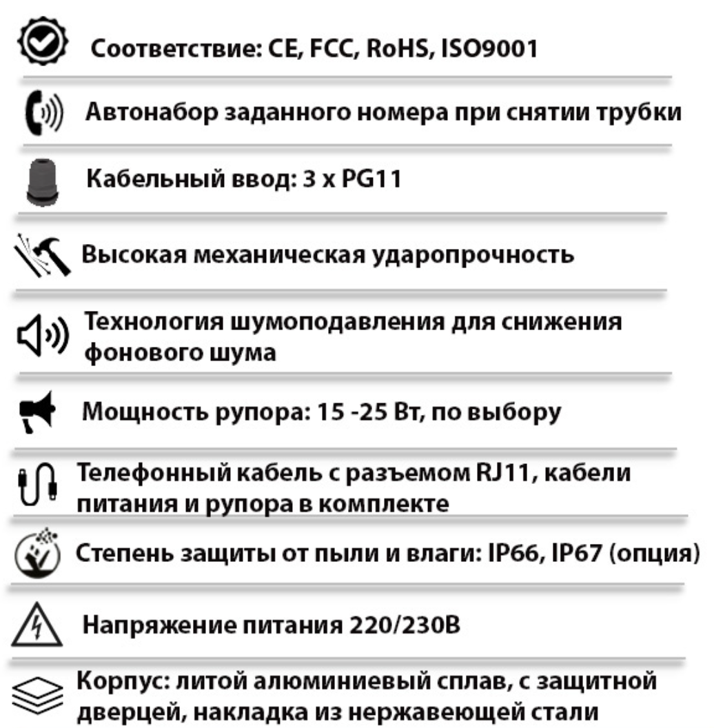 | Тип изделия | Промышленный всепогодный аналоговый телефонный аппарат с дверцей и рупорным громкоговорителем |
