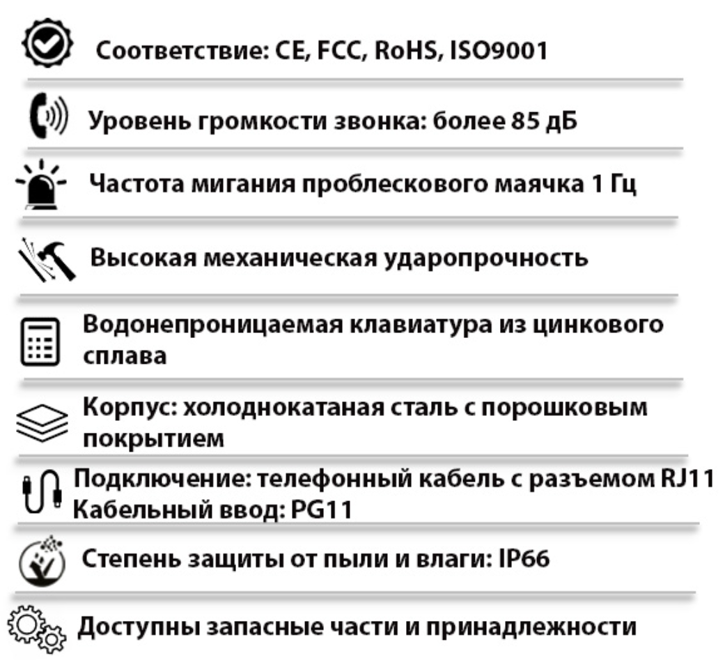 | Тип изделия | Промышленный всепогодный аналоговый телефонный аппарат с проблесковым маячком |