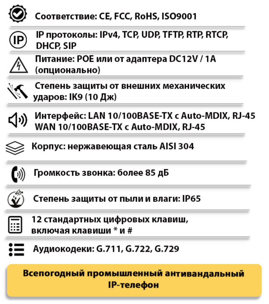 | Тип изделия | Промышленный всепогодный IP-телефонный аппарат |