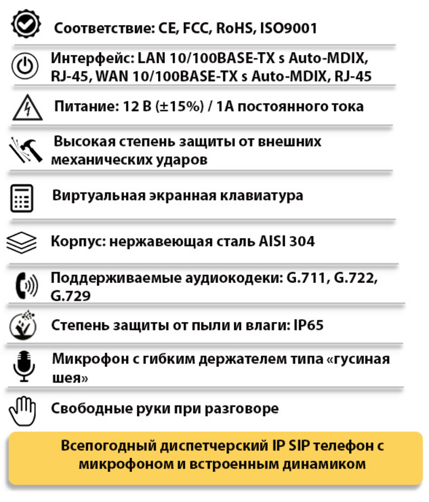 | Тип изделия | Всепогодный промышленный настольный IP-телефонный аппарат "свободные руки" |