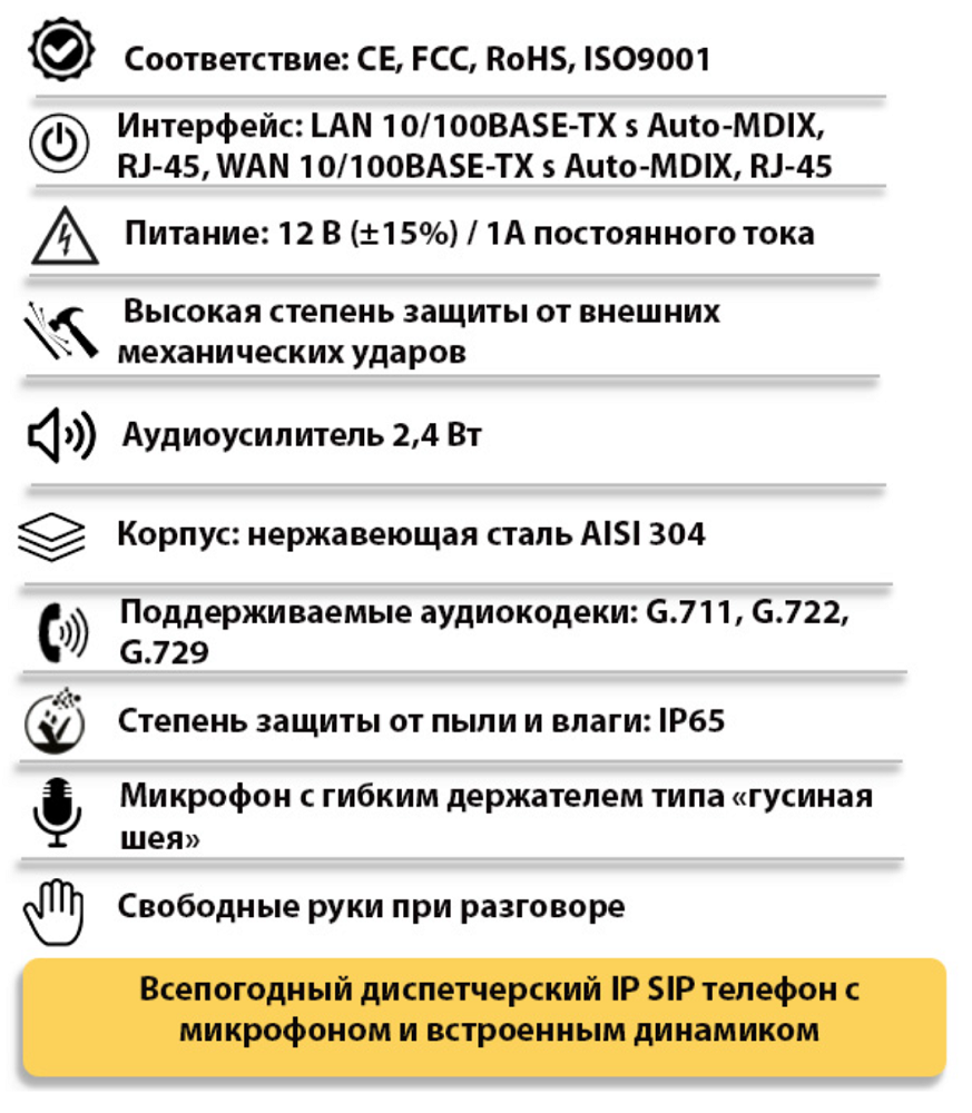 | Тип изделия | Всепогодный промышленный настольный IP-телефонный аппарат "свободные руки" |