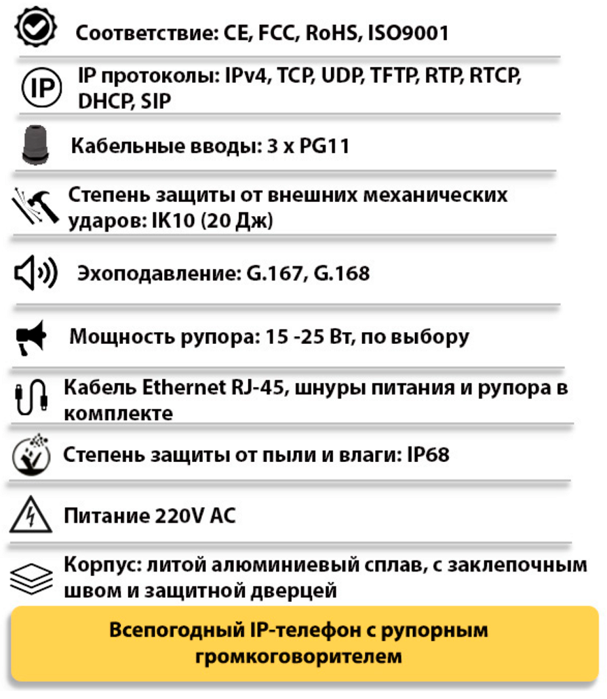 | Тип изделия | Промышленный всепогодный IP-телефонный аппарат с дверцей и рупорным громкоговорителем |