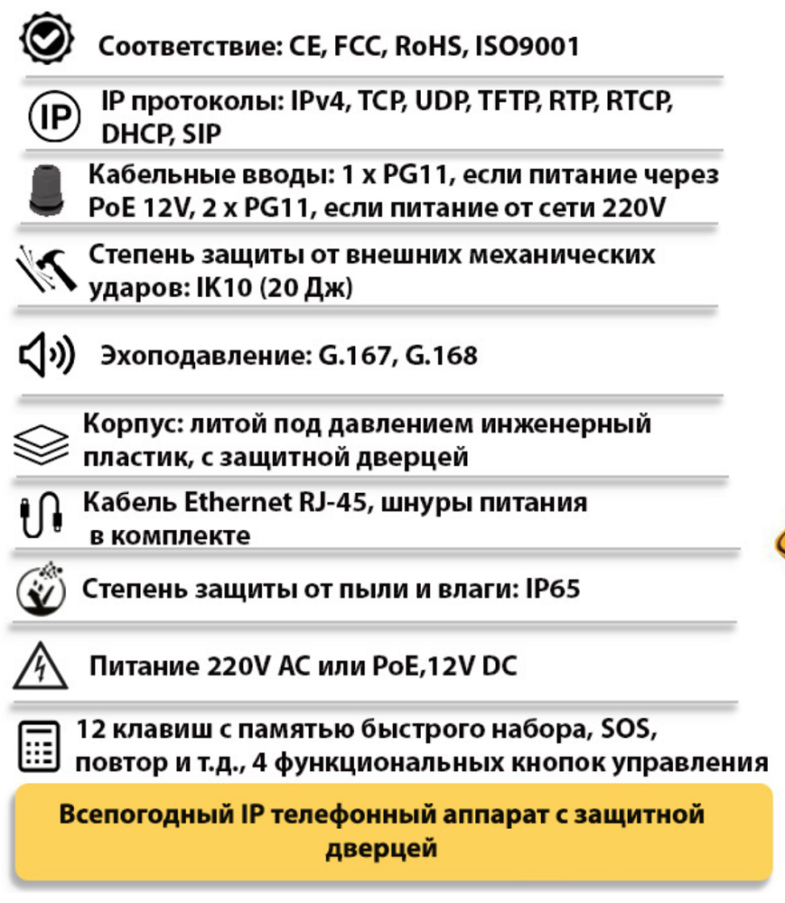 | Тип изделия | Промышленный всепогодный IP-телефонный аппарат с дверцей |