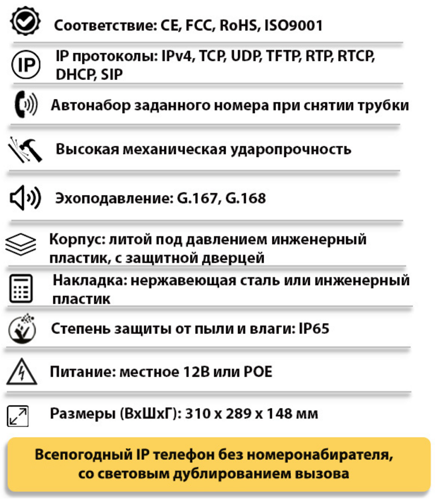 | Тип изделия | Промышленный всепогодный IP-телефонный аппарат с дверцей и проблесковым маячком, для прямого вызова |