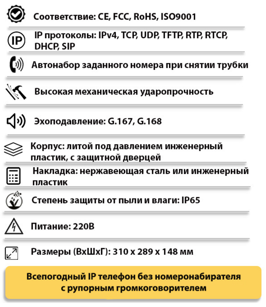 | Тип изделия | Промышленный всепогодный IP-телефонный аппарат с дверцей и рупорным громкоговорителем, для прямого вызова |