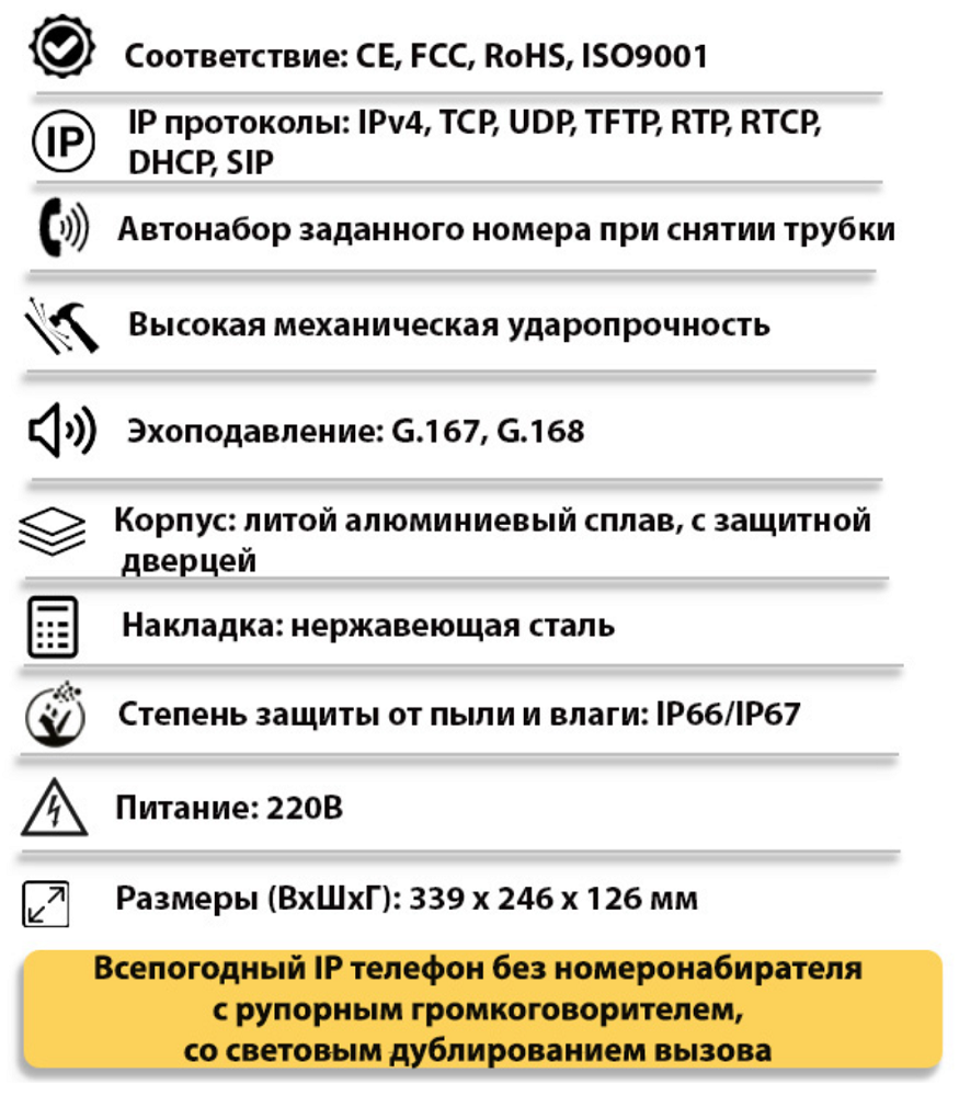 | Тип изделия | Промышленный всепогодный IP-телефонный аппарат с дверцей, рупором и проблесковым маячком, для прямого вызова |