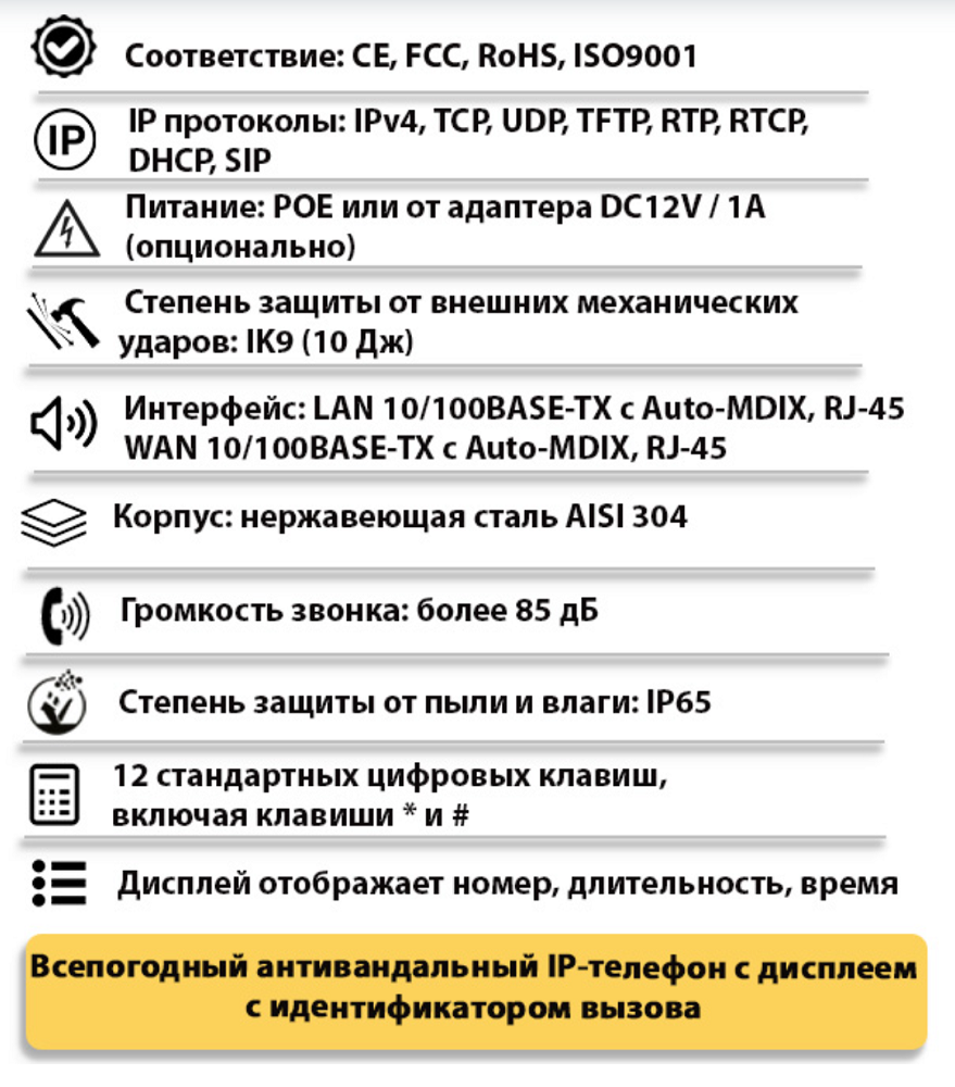 | Тип изделия | Промышленный всепогодный IP-телефонный аппарат с ЖК-дисплеем |