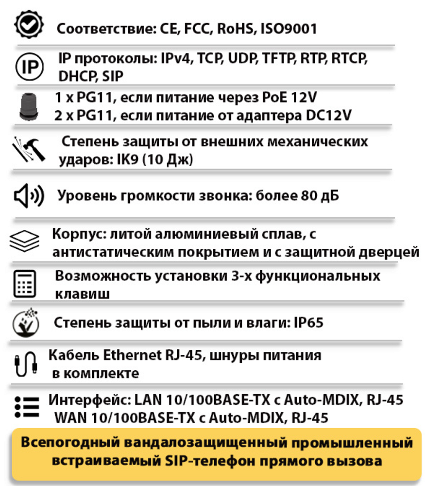 | Тип изделия | Всепогодный антивандальный IP-телефонный аппарат с защитной дверцей; горячая линия для общественных мест |