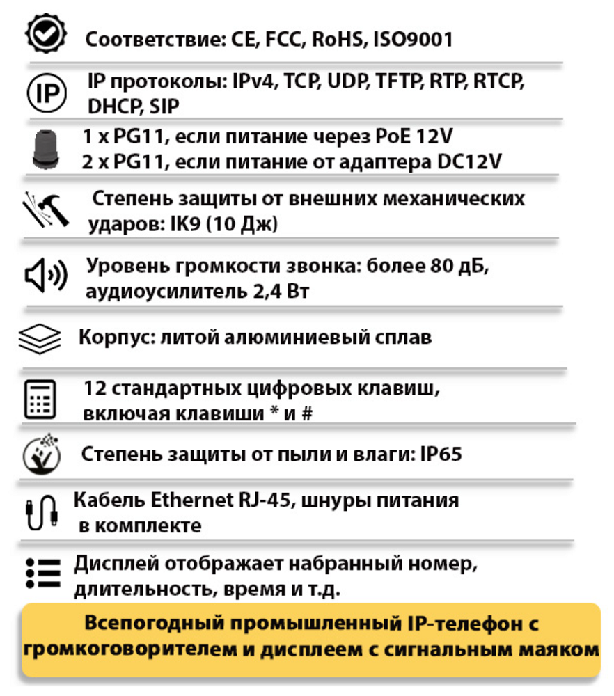 | Тип изделия | Промышленный всепогодный IP-телефонный аппарат с дисплеем |